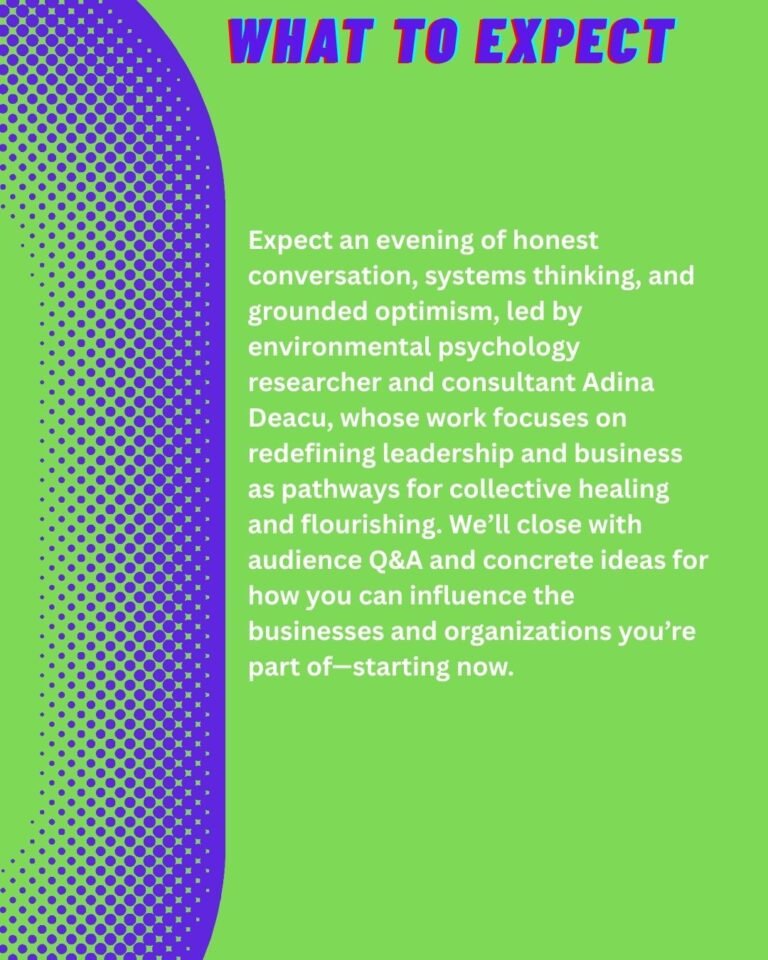 Expect an evening of honest conversation, systems thinking, and grounded optimism, led by environmental psychology researcher and consultant Adina Deacu, whose work focuses on redefining leadership and business as pathways for collective healing and flourishing. We’ll close with audience Q&A and concrete ideas for how you can influence the businesses and organizations you’re part of—starting now.