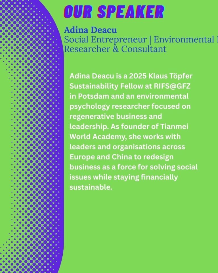 Adina Deacu is a 2025 Klaus Töpfer Sustainability Fellow at RIFS@GFZ in Potsdam and an environmental psychology researcher focused on regenerative business and leadership. As founder of Tianmei World Academy, she works with leaders and organisations across Europe and China to redesign business as a force for solving social issues while staying financially sustainable.